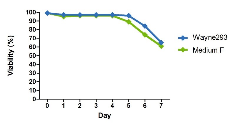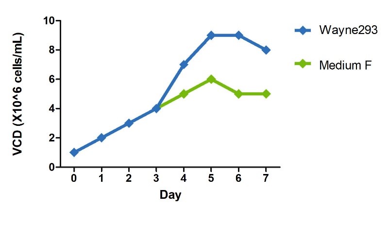 Growth and expression of HEK293 F cells after transfection in Wayne293™ and other commercial media.