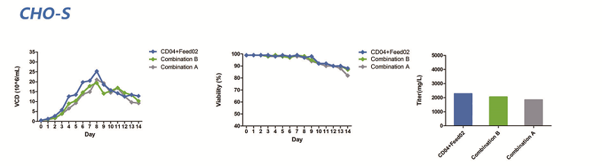Cell line: K1 (hIgG), CHO-S (hIgG), K1-SV (FC-Fusion Protein); control: Combination A is the medium and feed of supplier G, Combinational B is the medium supply of supplier G Commercial H feed; 12mL shake flask, working volume 30mL, ф25mm, 125rpm, humidity 75%, 5% CO2, 37 ℃ for 14 days.