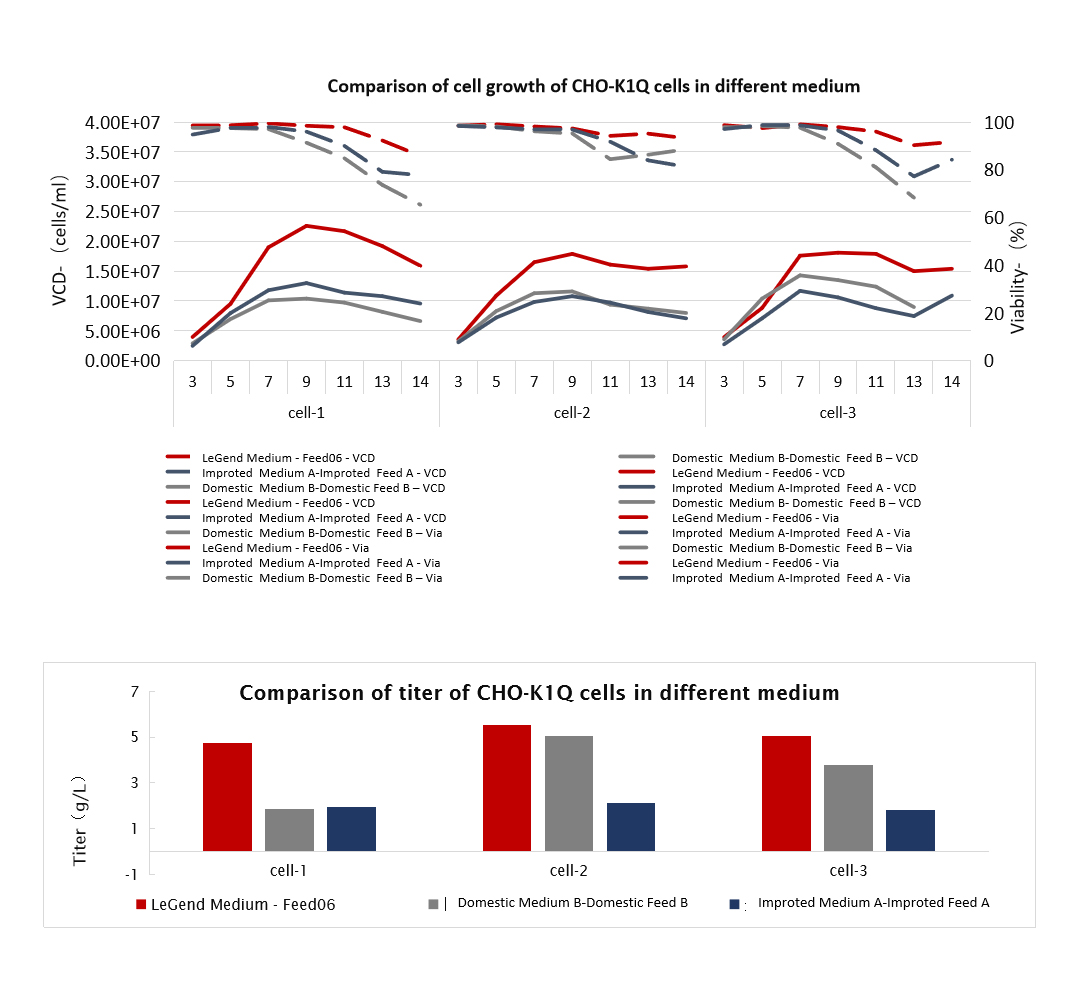 The target cells were three CHO-K1Q cell lines, and LeGend Medium & Feed06 Supplement were compared with other commercial medium for Fed-Batch culture. The results showed that LeGend Medium & Feed06 Supplement was better than other commercial medium in terms of cell growth and titer under the same conditions.