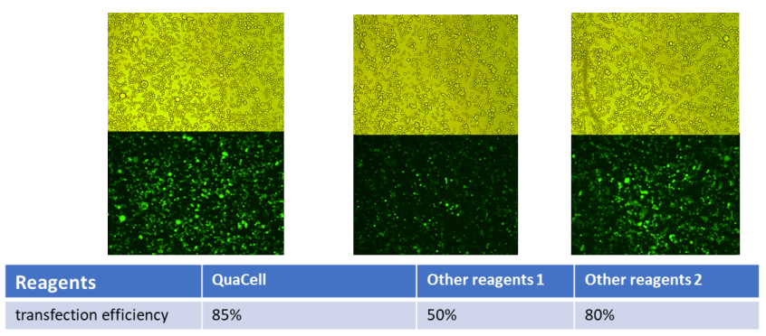 The plasmid with GFP label was used to transfect HEK 293 cells according to the instructions of QuaCell transfection reagent, Other reagents 1 and Other reagents 2. The fluorescence expression of the cells was observed under the microscope 48 hours after transfection. The transfection efficiency of QuaCell can reach 85%.