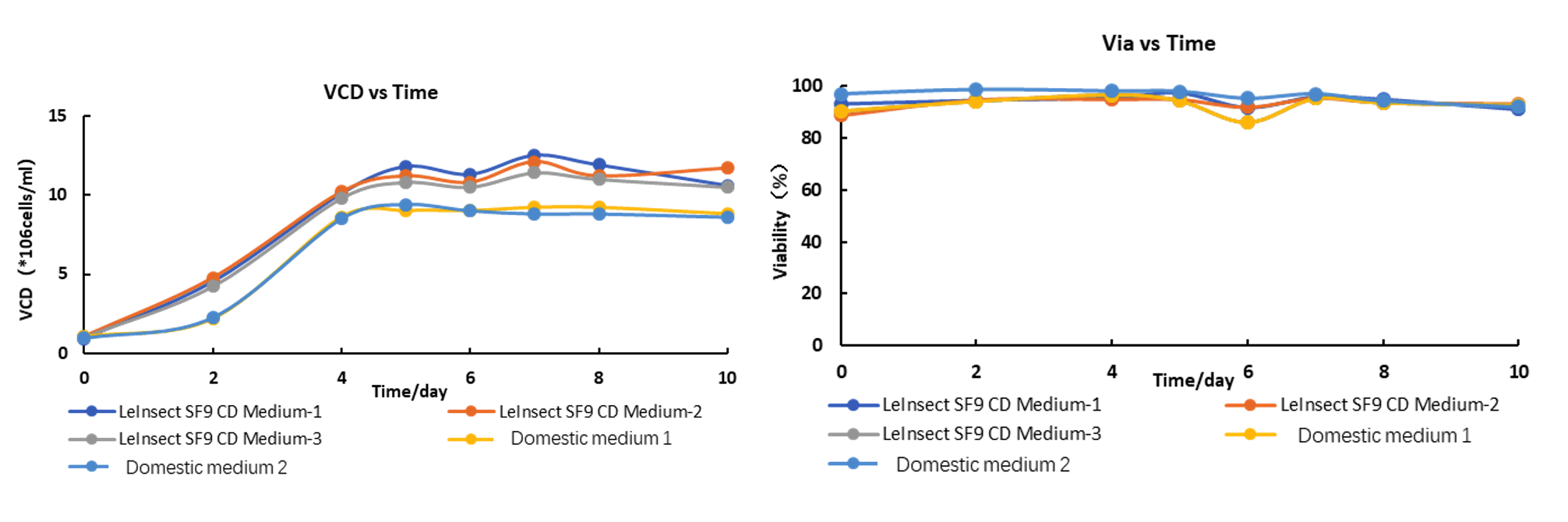The test cells were SF9 cells. The growth of different batches of QuaCell® LeInsect SF9 CD Medium was higher than that of domestic hydrolysate products, and there was no significant difference in cell growth between different batches.