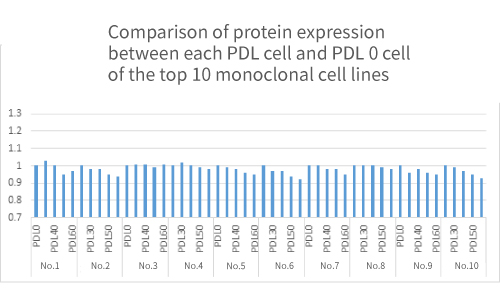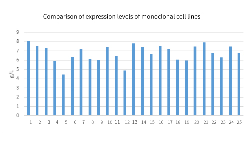 Using a platform fed-batch culture process that is not optimized for specific protein antibodies, the average expression level has reached more than 6.7g/L, of which the highest expression is 8.1/L, and there are 20 monoclonal cell lines with an expression level of more than 6 g/L, can comprehensively consider CQA such as protein quality, expression, process scalability, etc. to screen cell lines.
